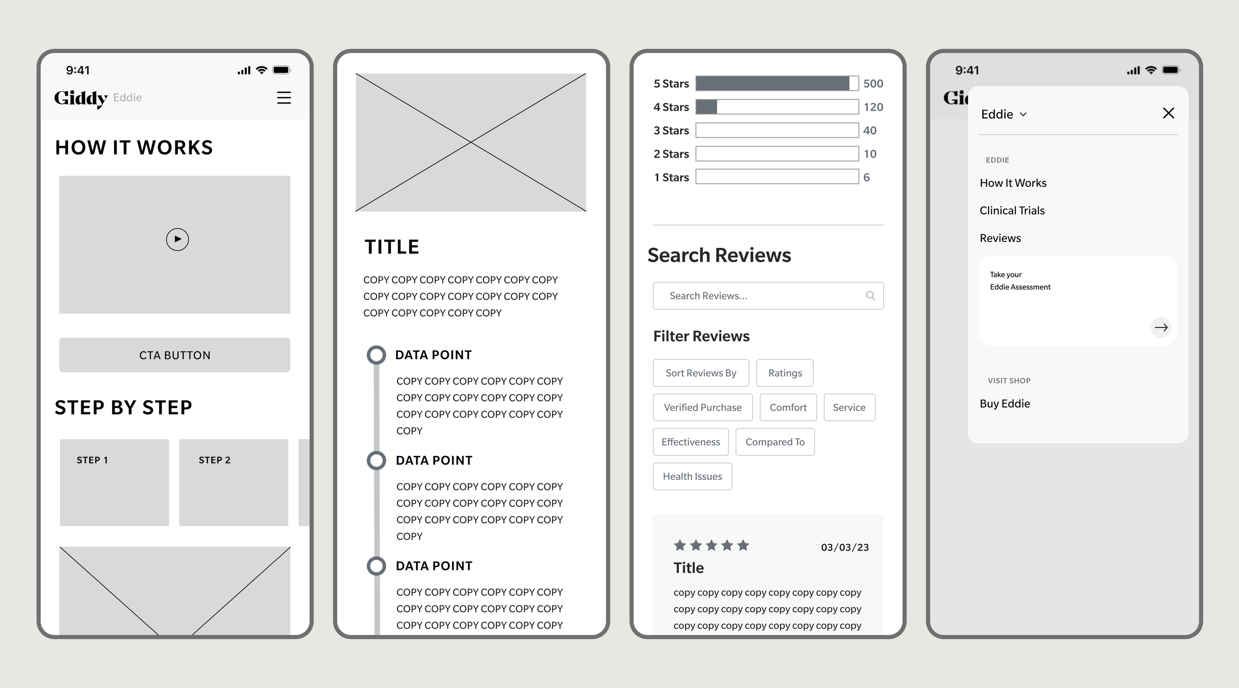 In our early design phase, we focused on creating low-fidelity mockups for the Eddie site with a specific emphasis on structuring the navigation. We began by outlining sections of content for each page, knowing that a deeper dive into these would come later in the design process.